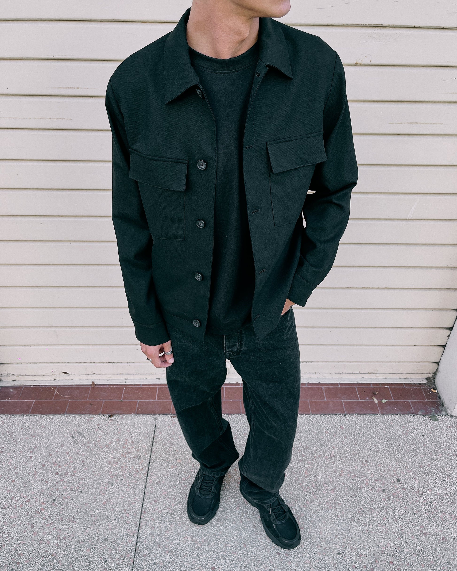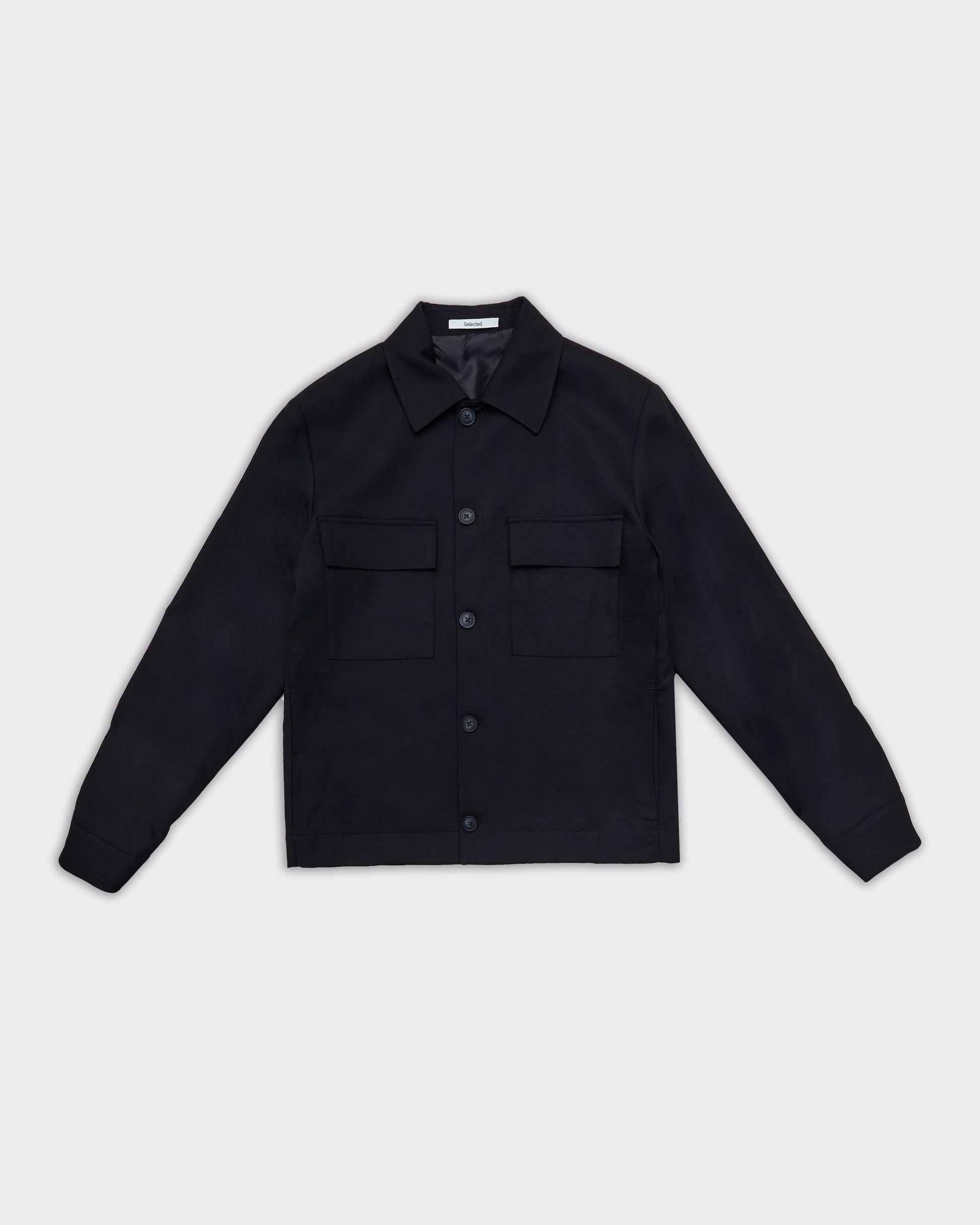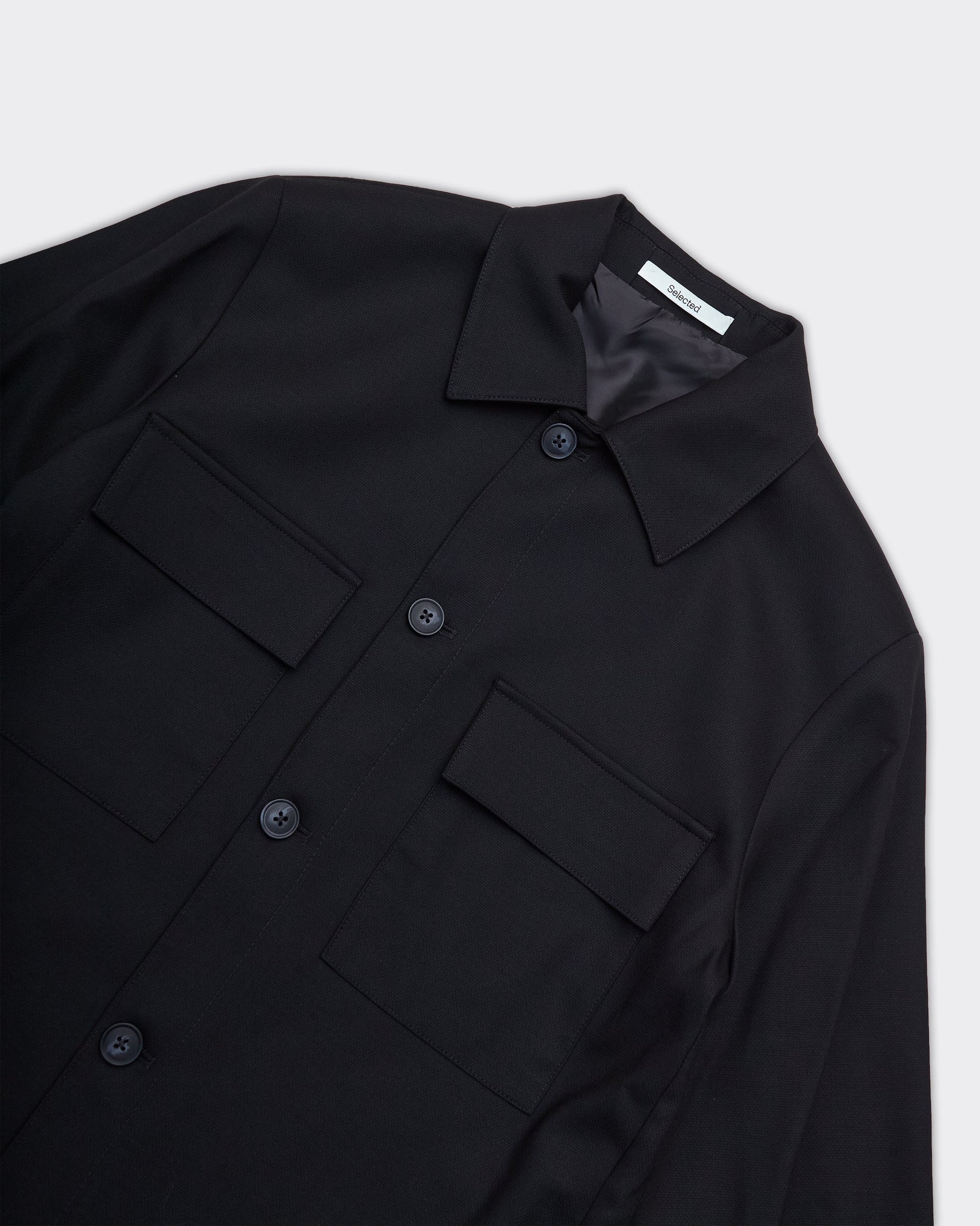 Blazer nero con tasche applicate sul petto, bottoni centrati e colletto classico. Realizzato in tessuto uniforme senza decorazioni visibili.