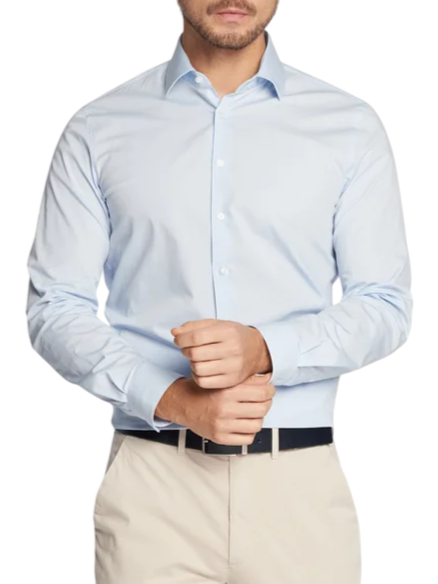 Camicia da uomo realizzata in popeline di cotone stretch. Colletto alla francese, maniche lunghe. Ricamo del logo sul petto.97% cotone 3% elastan
