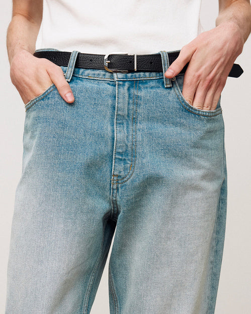 Cintura in pelle nera con texture embossed, fibbia metallica argentata sul davanti.