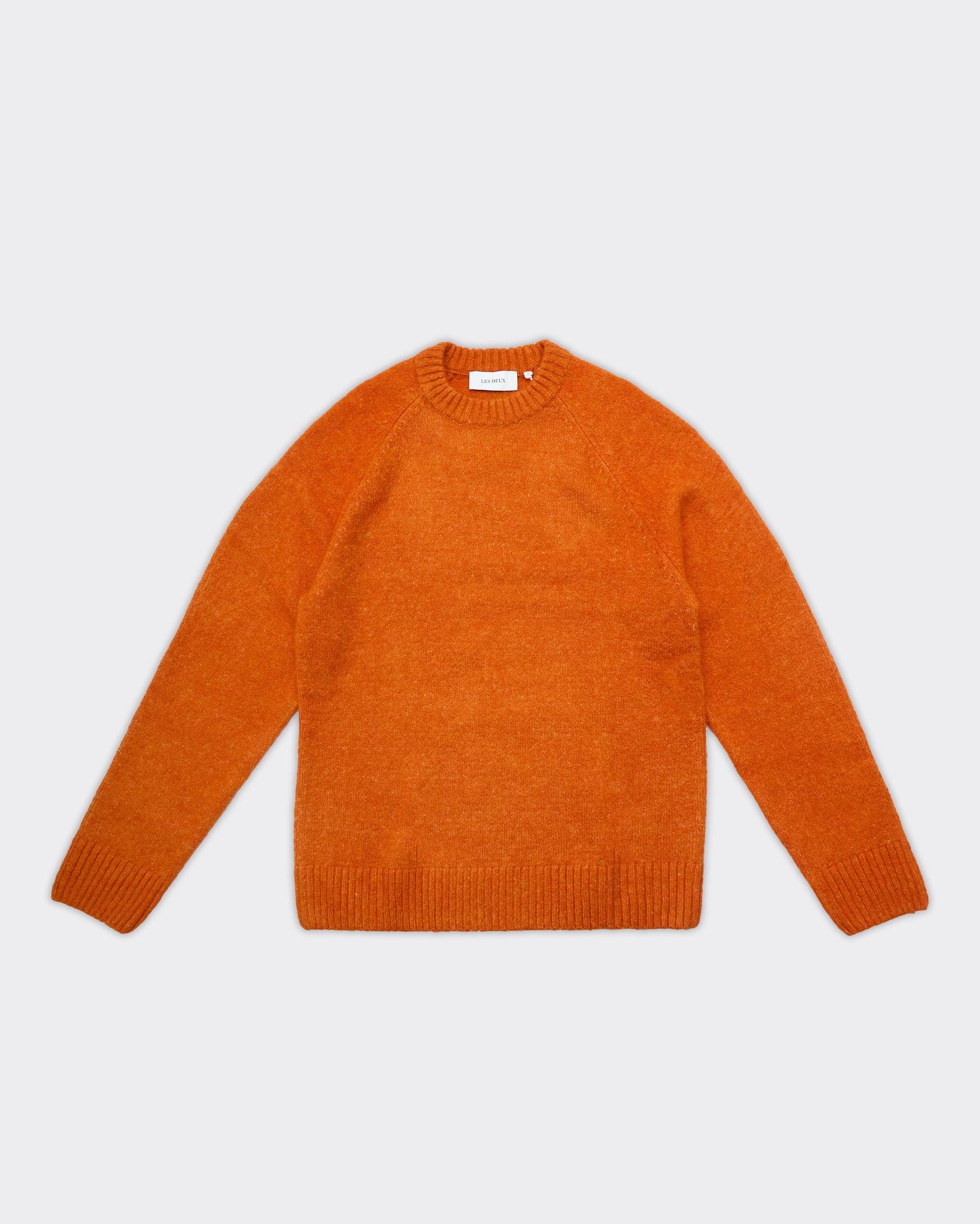 Questo pullover color fiamma dorata presenta una trama a maglia visibile, con bordi a coste sul collo, polsini e orlo. Nessun logo, ricamo o stampa visibile.