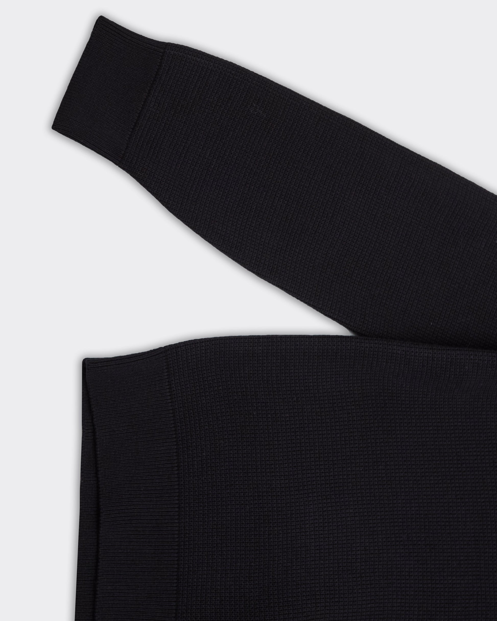 Maglia nera in maglia con struttura visibile. Collo arrotondato senza decorazioni aggiuntive.