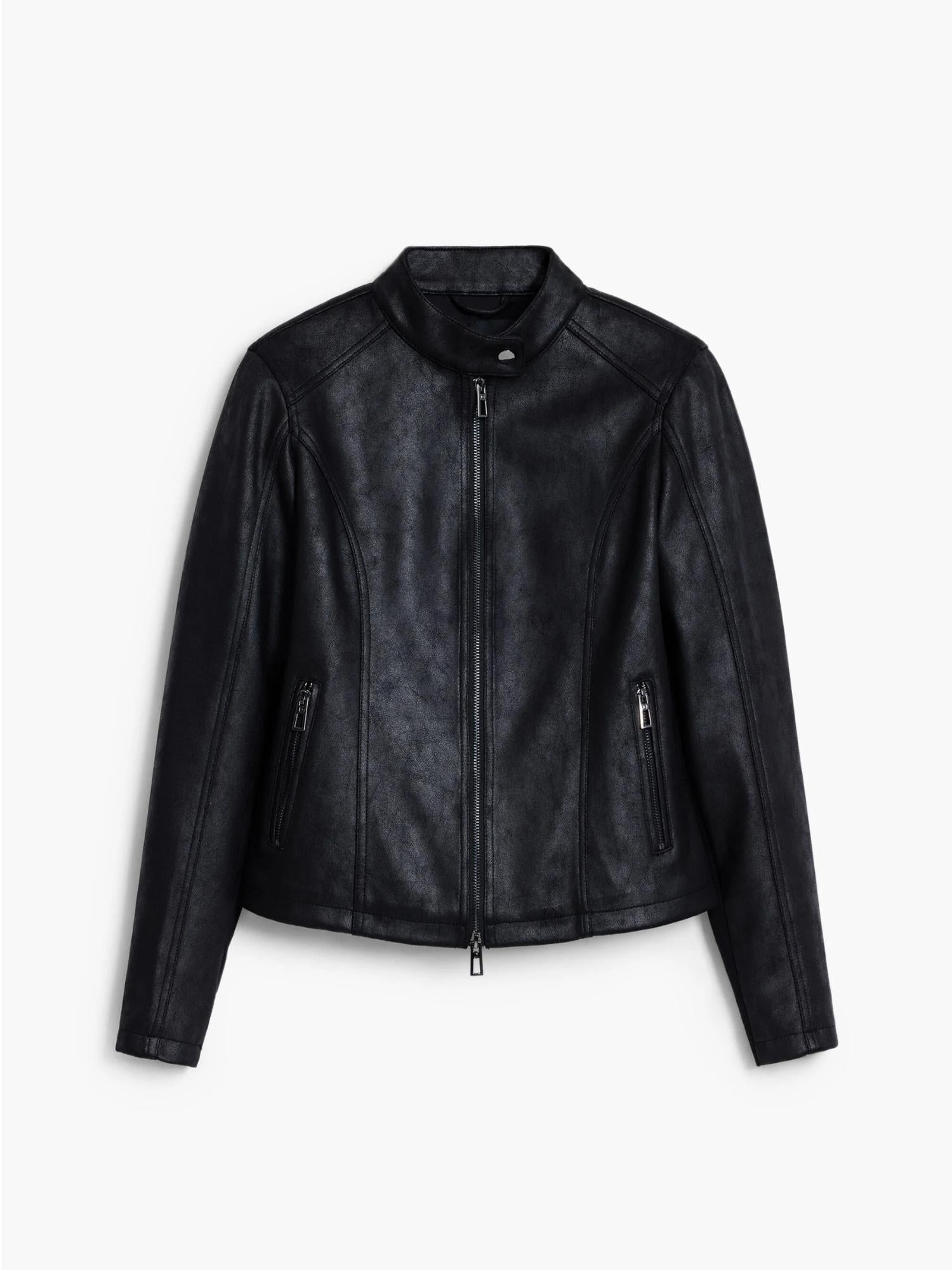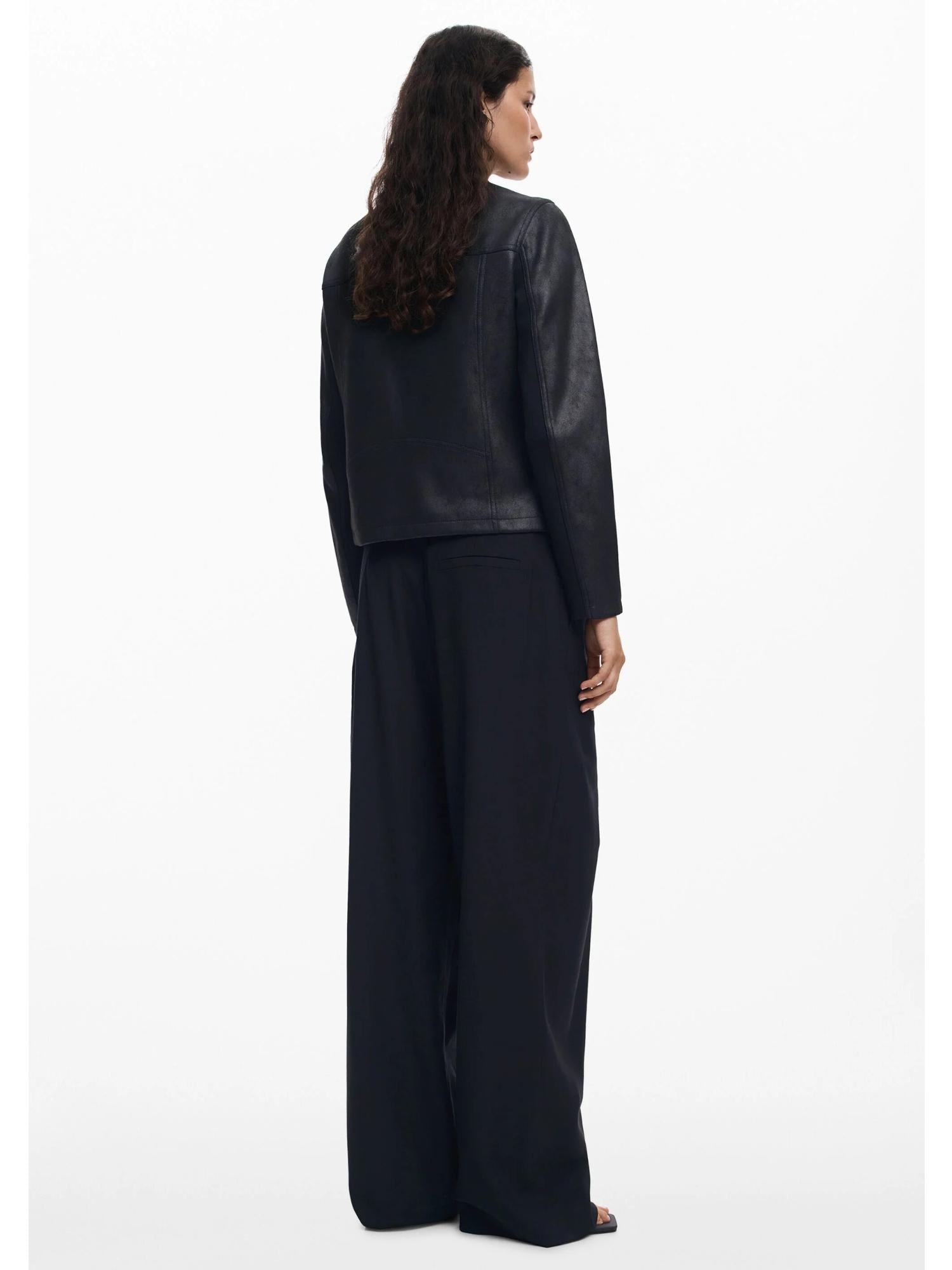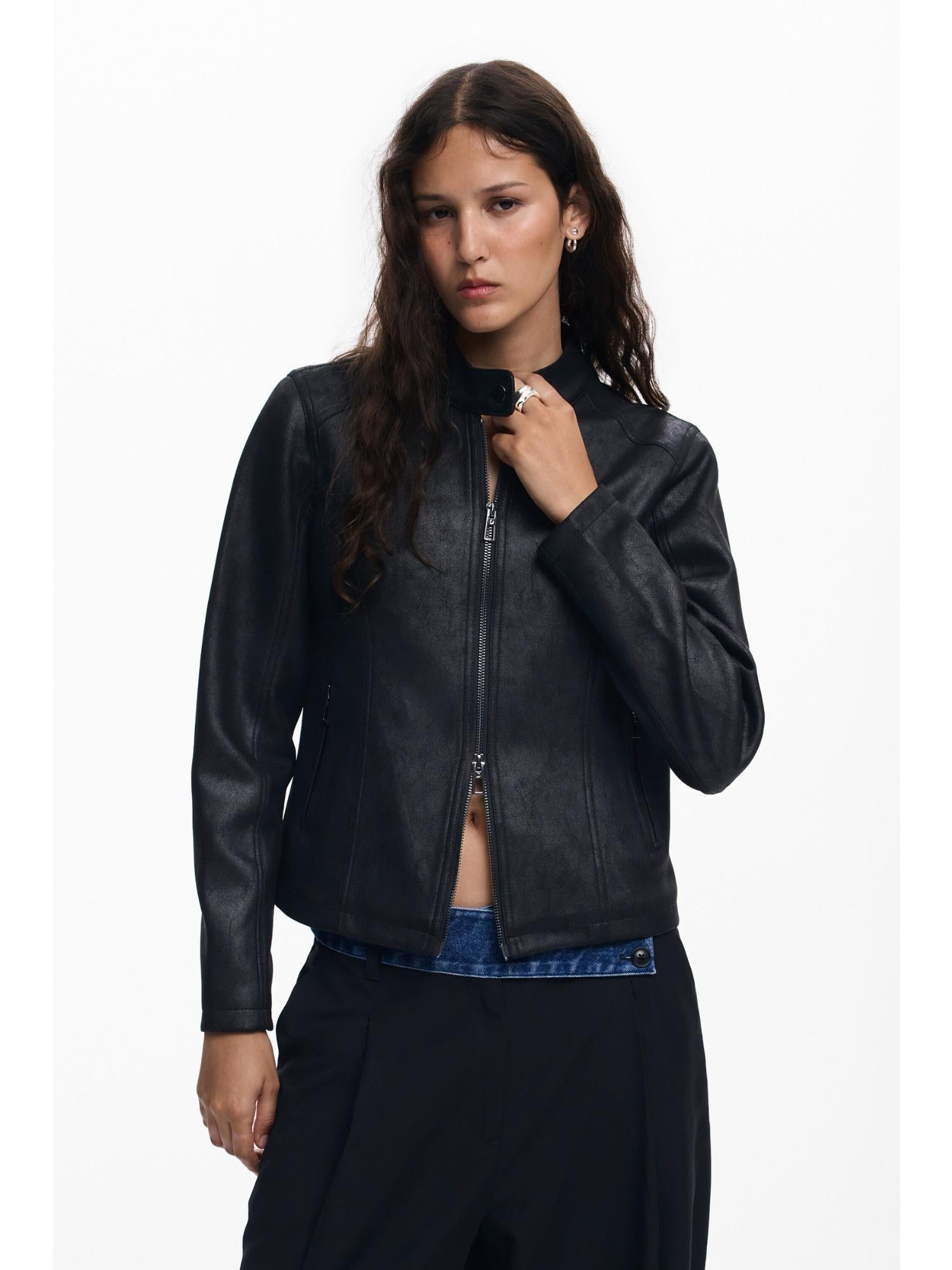 Giacca corta da donna effetto pelle dal design moderno e minimal, caratterizzata da collo alla coreana, chiusura con cerniera frontale e pratiche tasche anteriori. Le maniche combinate in tessuto a maglia aggiungono un tocco di originalità e comfort, rendendola perfetta per un look urbano e contemporaneo. Realizzata con materiali sostenibili in poliestere riciclato, fa parte della collezione Autunno/Inverno 2025, progettata a Barcellona. Fit regolare, ideale per outfit casual o più ricercati. Composizione esterna: 96% poliestere, 4% elastan. Fodera interna: 100% poliestere riciclato.