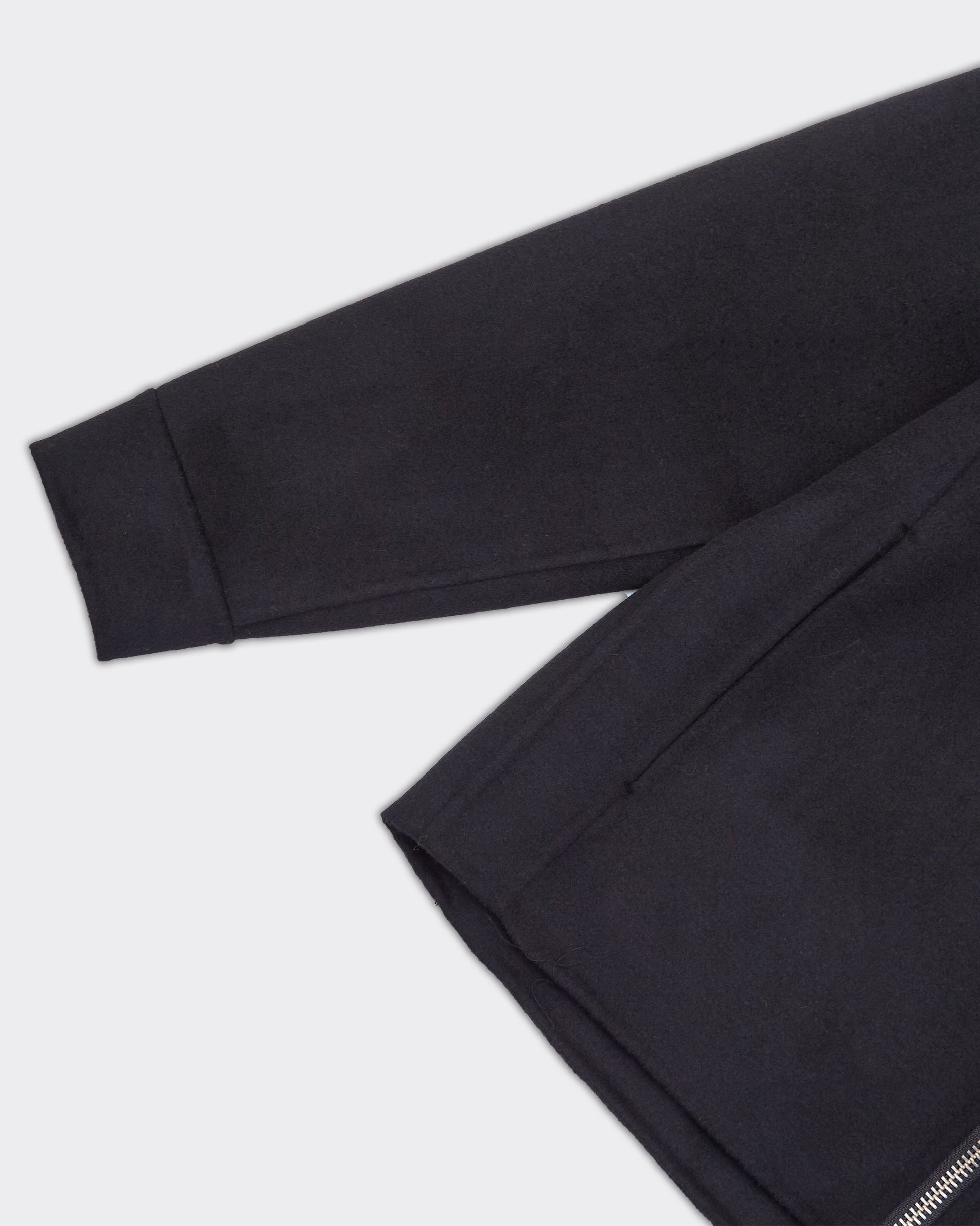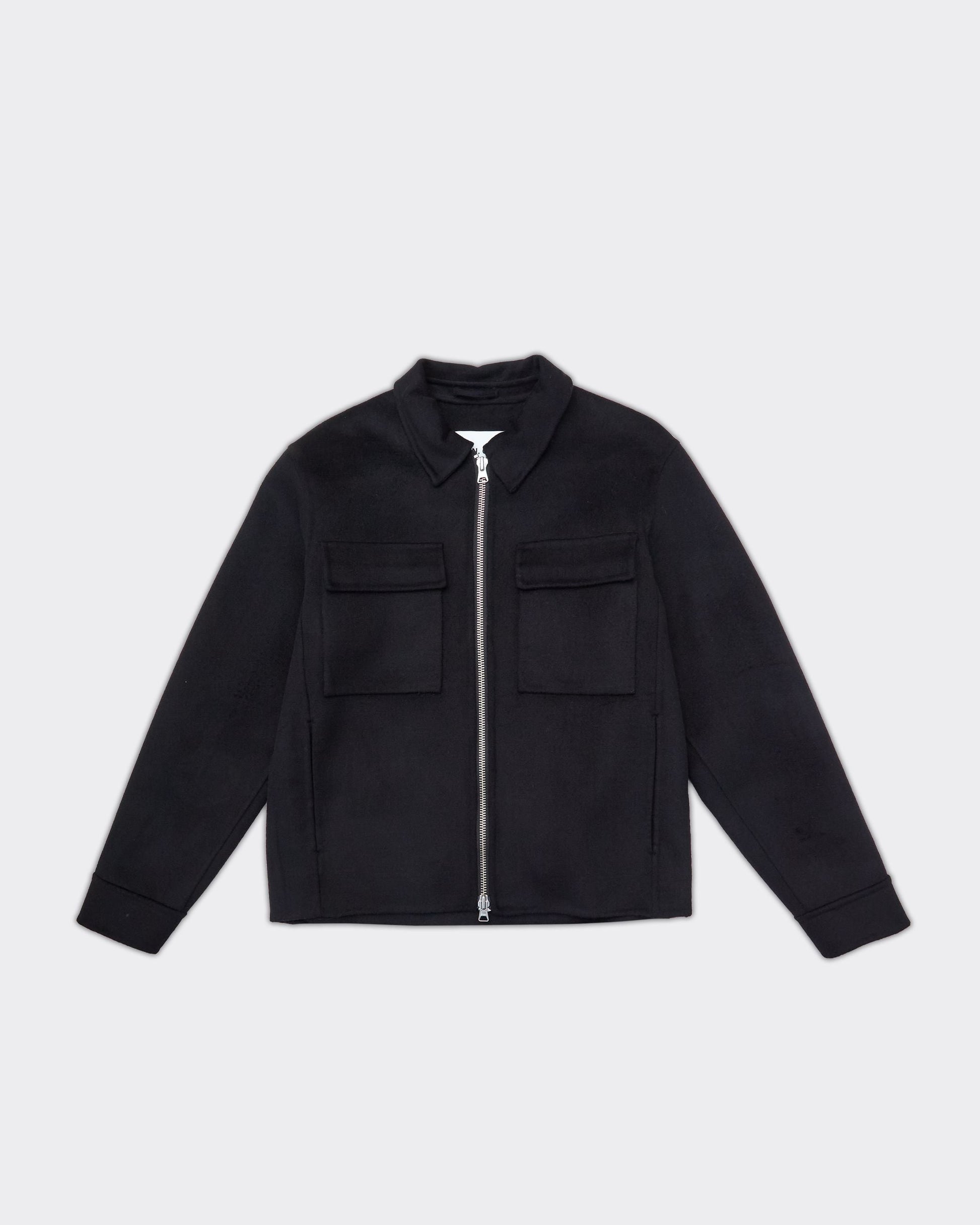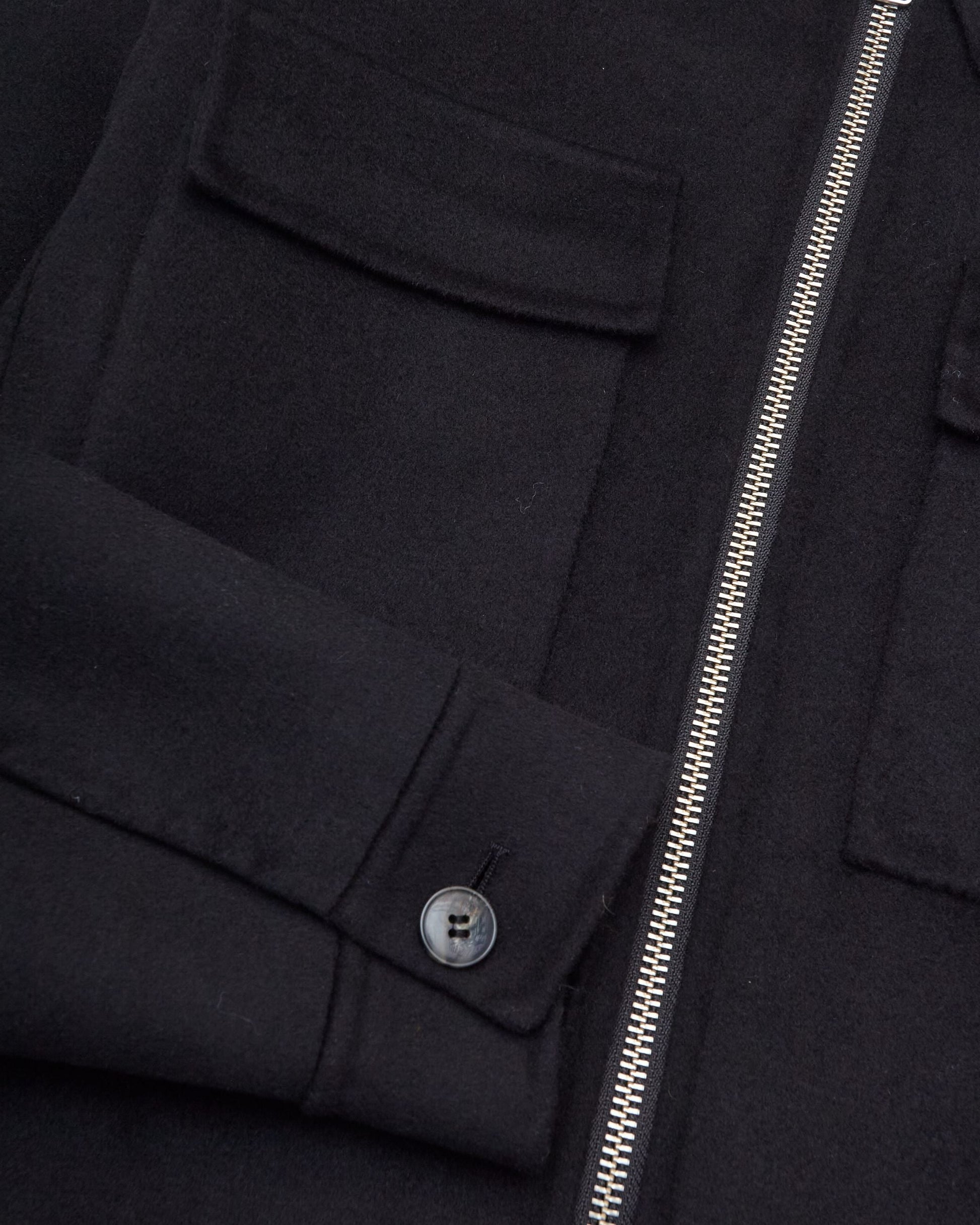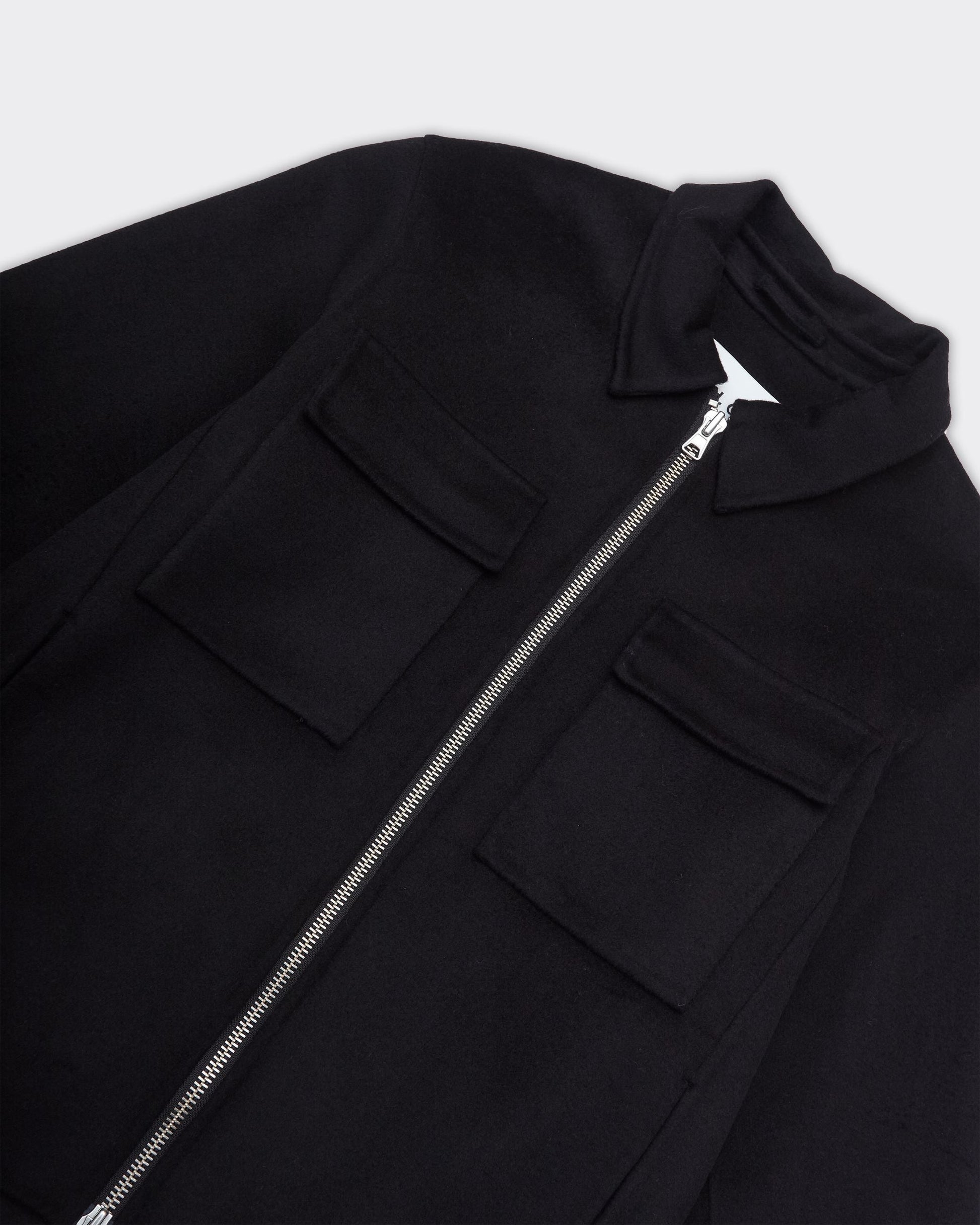 Giacca lunga fino ai fianchi, realizzata in misto lana double-face spazzolata con trama semplice. Presenta due tasche oblique sul petto, bottoni in finto corno e cerniera con logo.