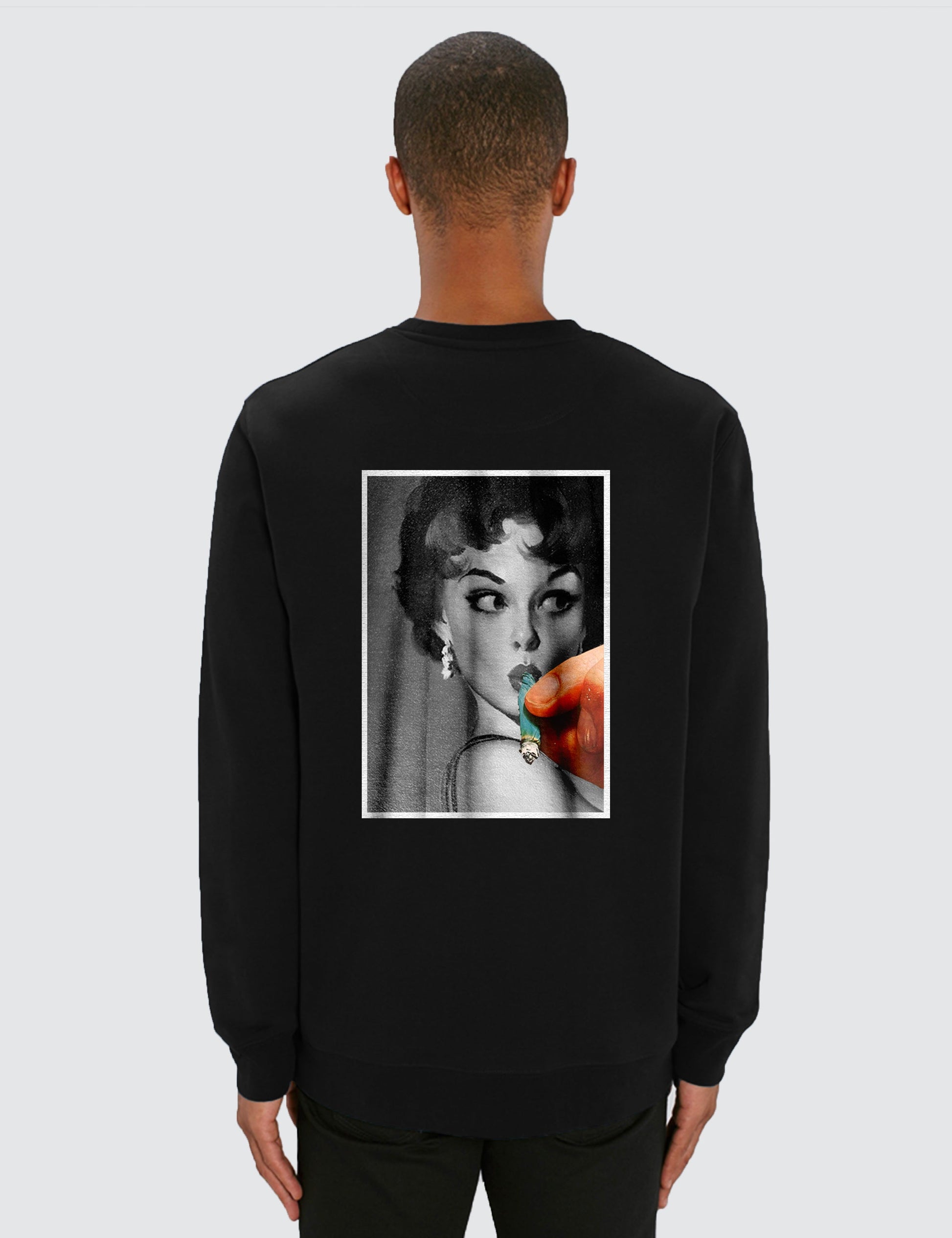 Lady Smoker Crewneck features embroidery minimal logo on front and stitched printed satin patch on back.