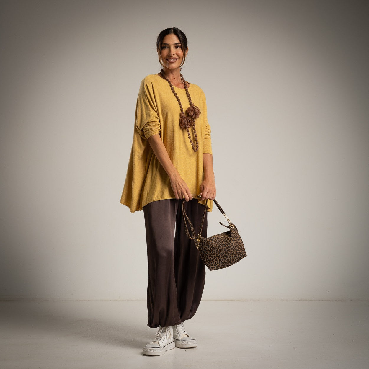 Questa maglia over size in maglia fine, dal taglio asimmetrico e scivolato, regala comfort e stile senza rinunciare alla femminilità. Il colore ocra dona luminosità e calore, facile da abbinare a denim, pantaloni fluidi o gonne midi.