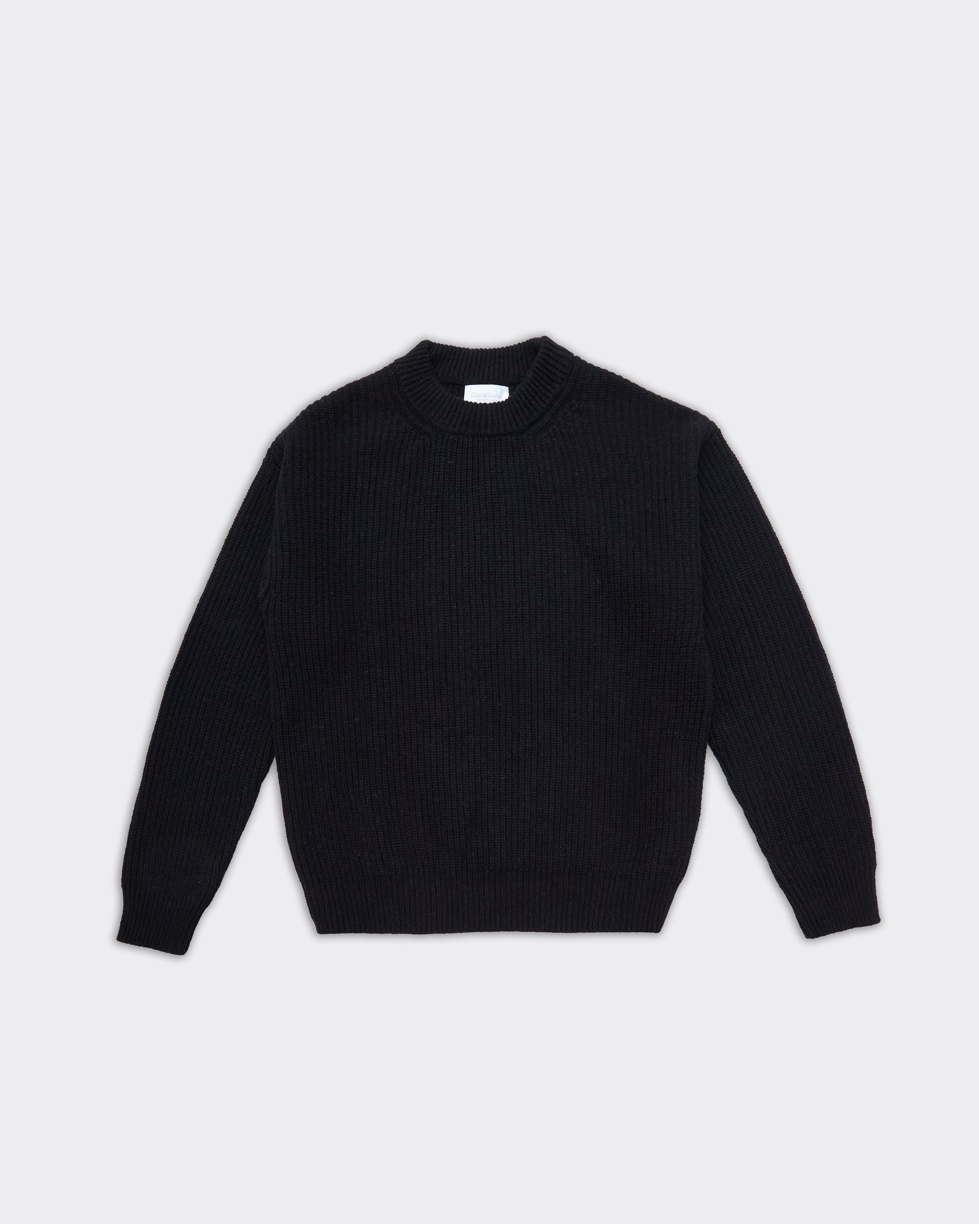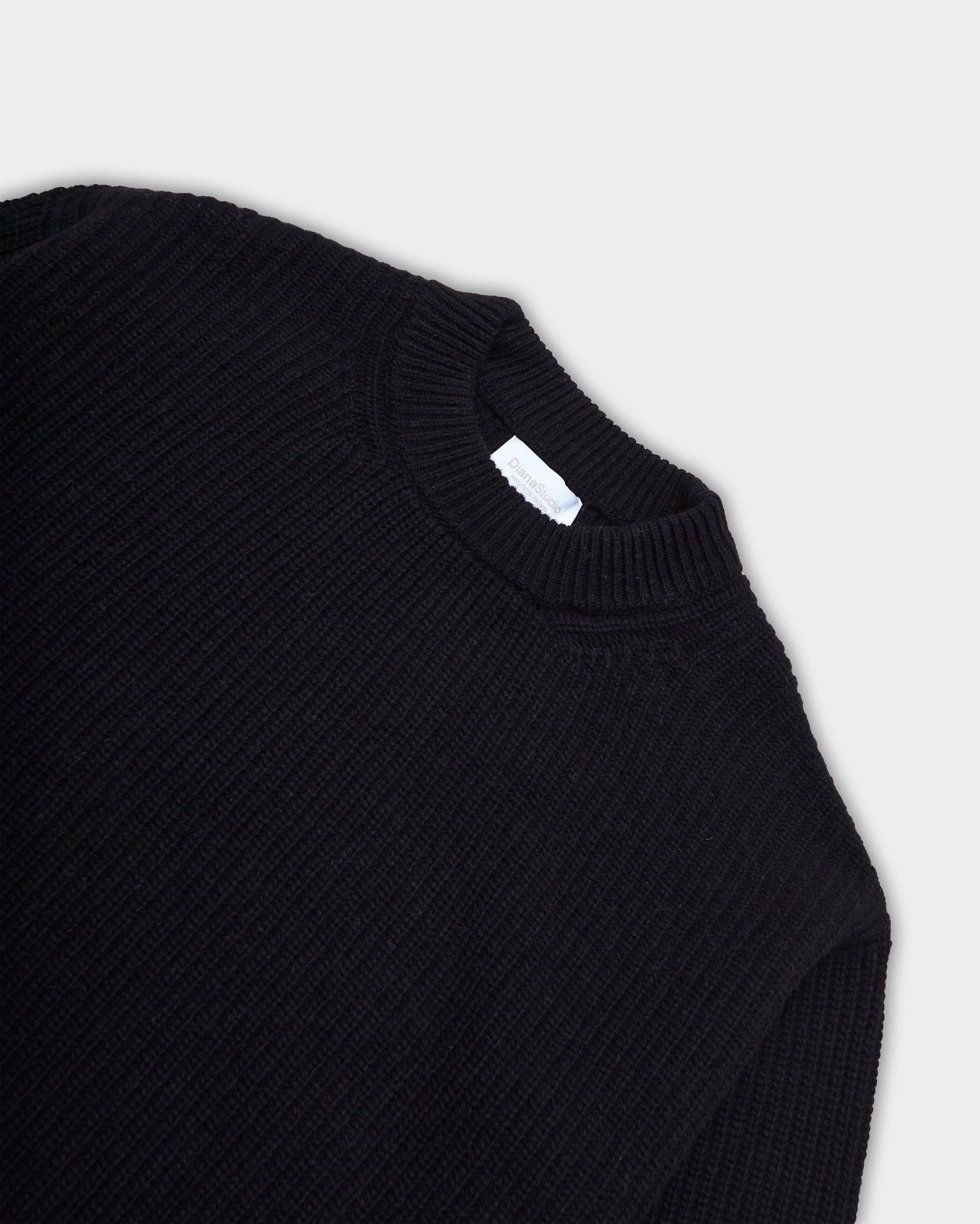 Maglione nero in maglia, design semplice senza elementi decorativi visibili, girocollo a coste.