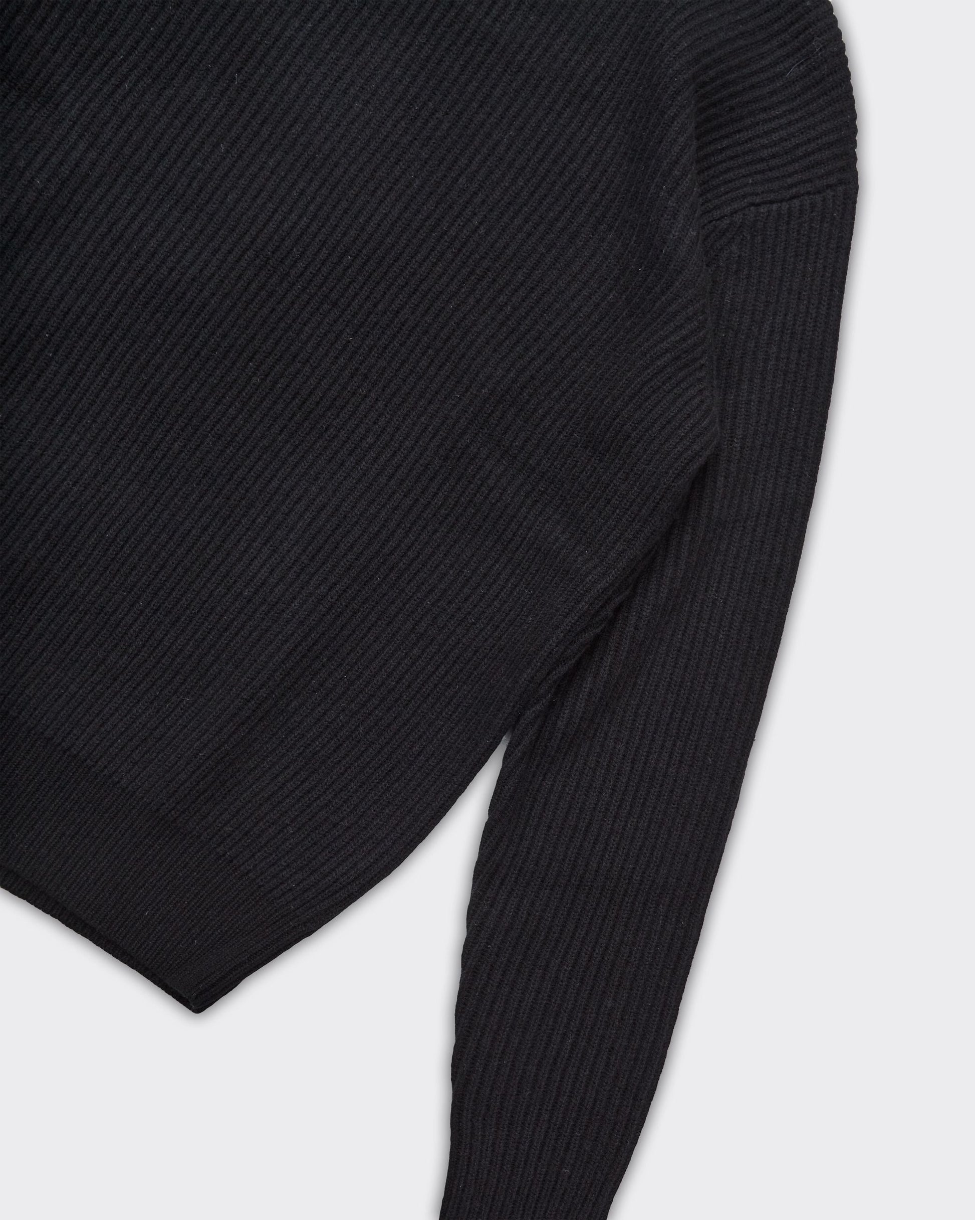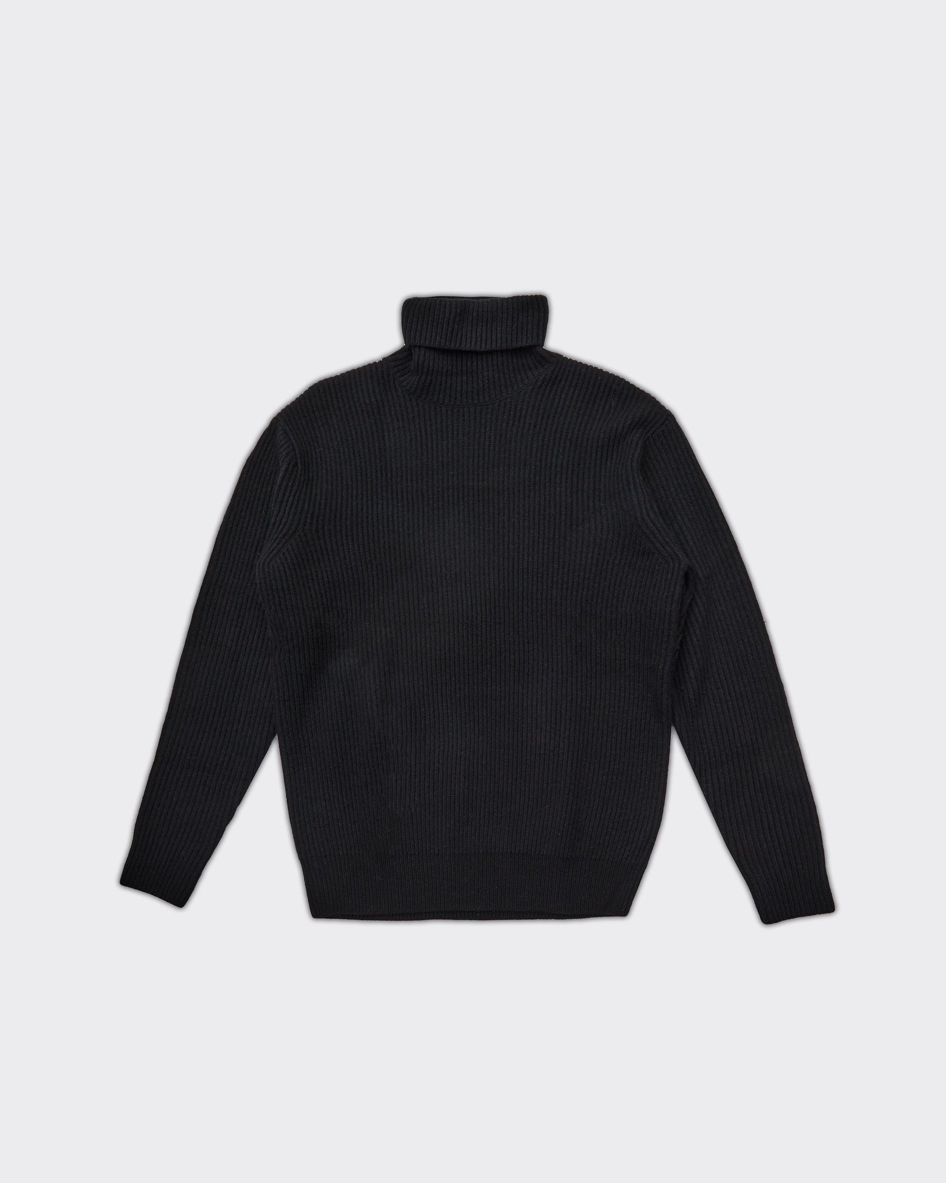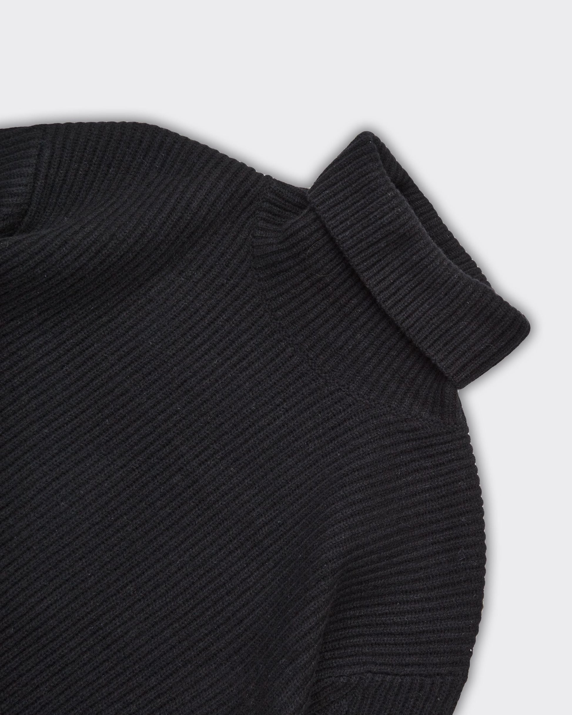 Maglione a collo alto nero in tessuto a coste, senza decorazioni visibili.
