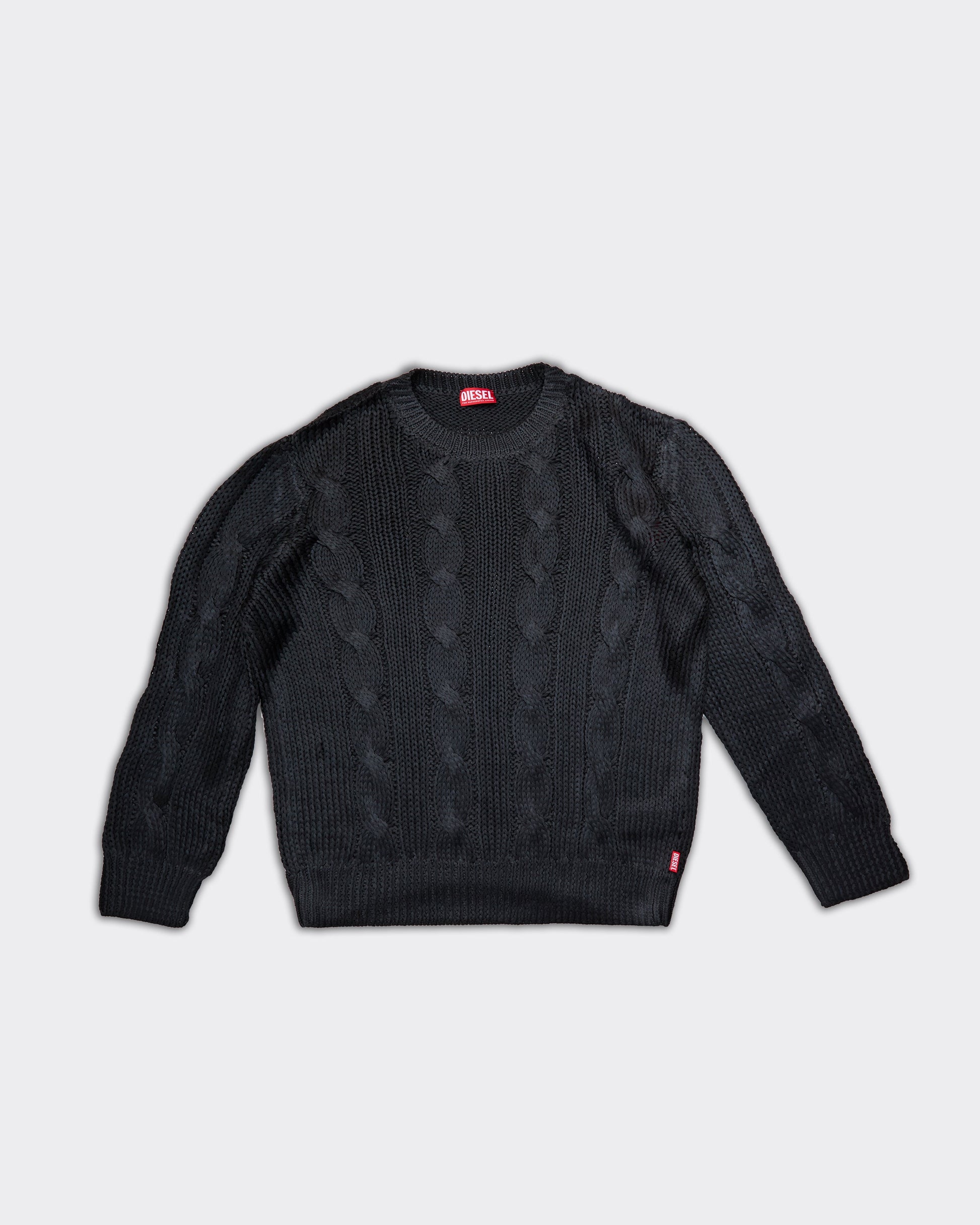 Una sovversione del classico maglione, questo modello da uomo ha un tono celebrativo ma discreto. È lavorato a maglia con trecce sul davanti e sulle maniche, poi termo-pressato per ottenere una finitura lucida e levigata.