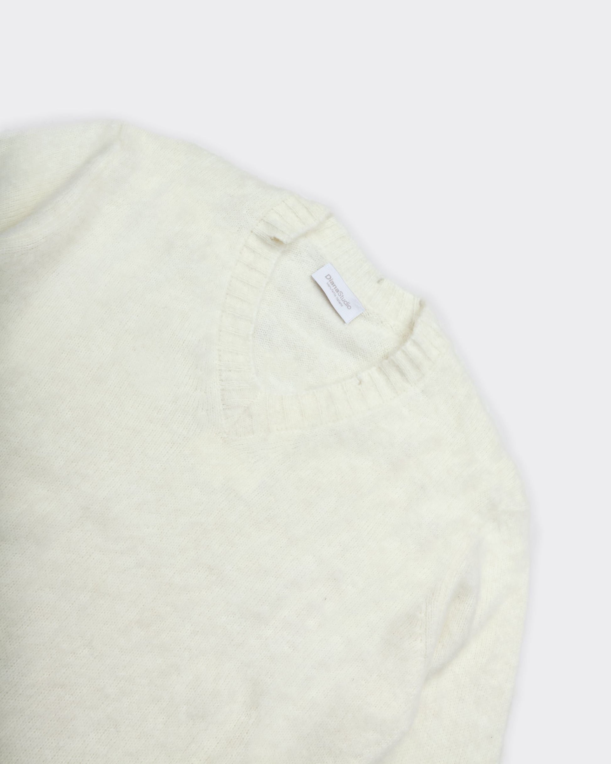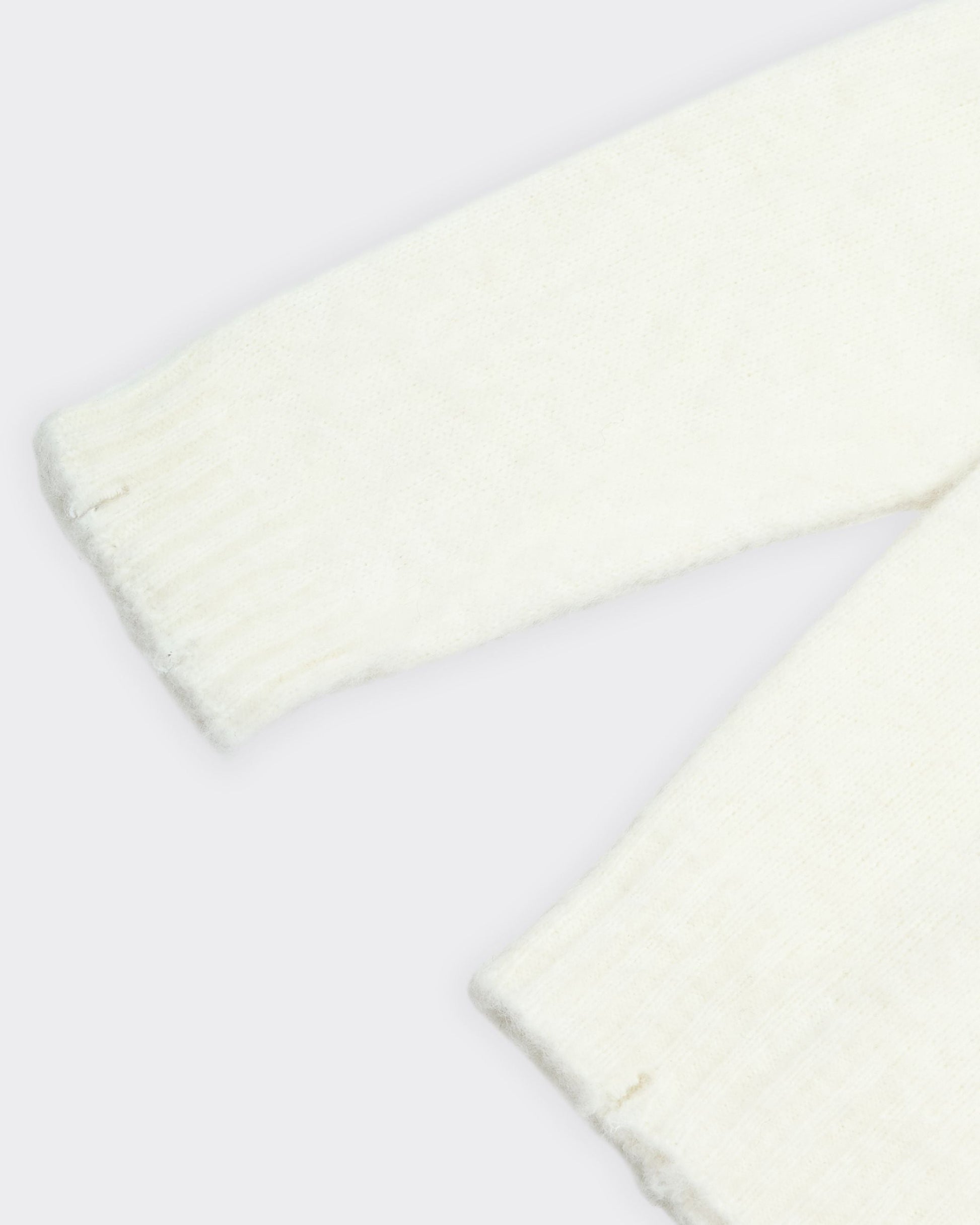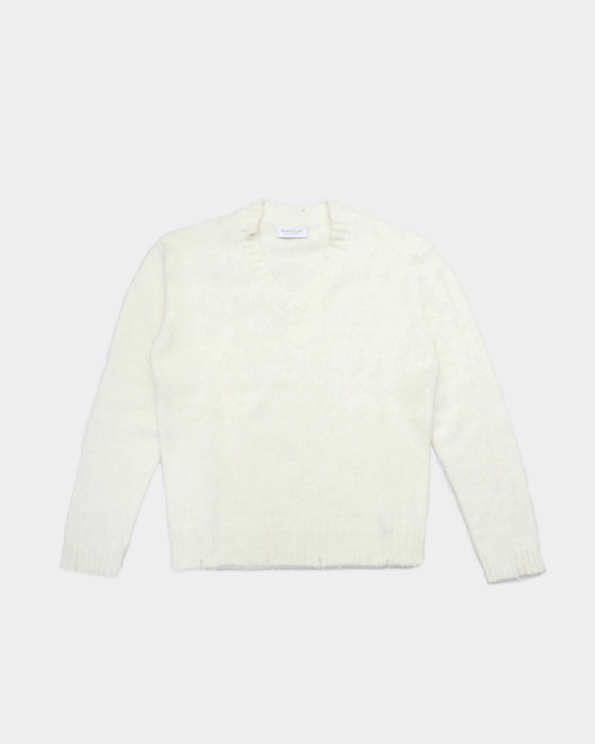Maglione bianco con scollo a V, finiture a coste su collo, polsini e bordo inferiore.