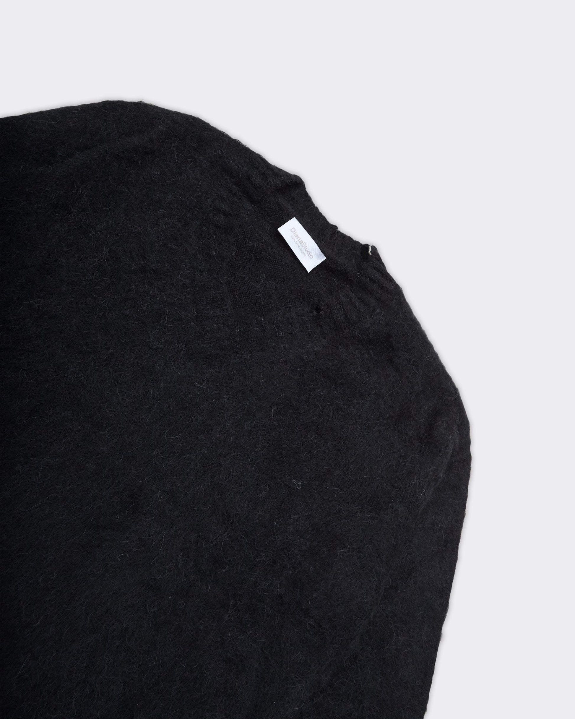 Maglione nero con scollo a V, realizzato in tessuto morbido e lanoso. Polsini e orlo a coste.