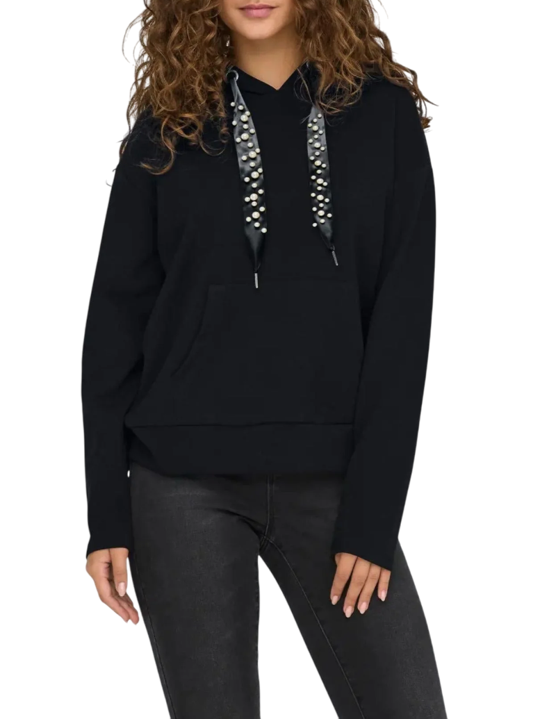 Felpa da donna in misto viscosa. Cappuccio fisso con coulisse impreziosita da perline. Tasca a marsupio. 60% poliestere 40% viscosa
