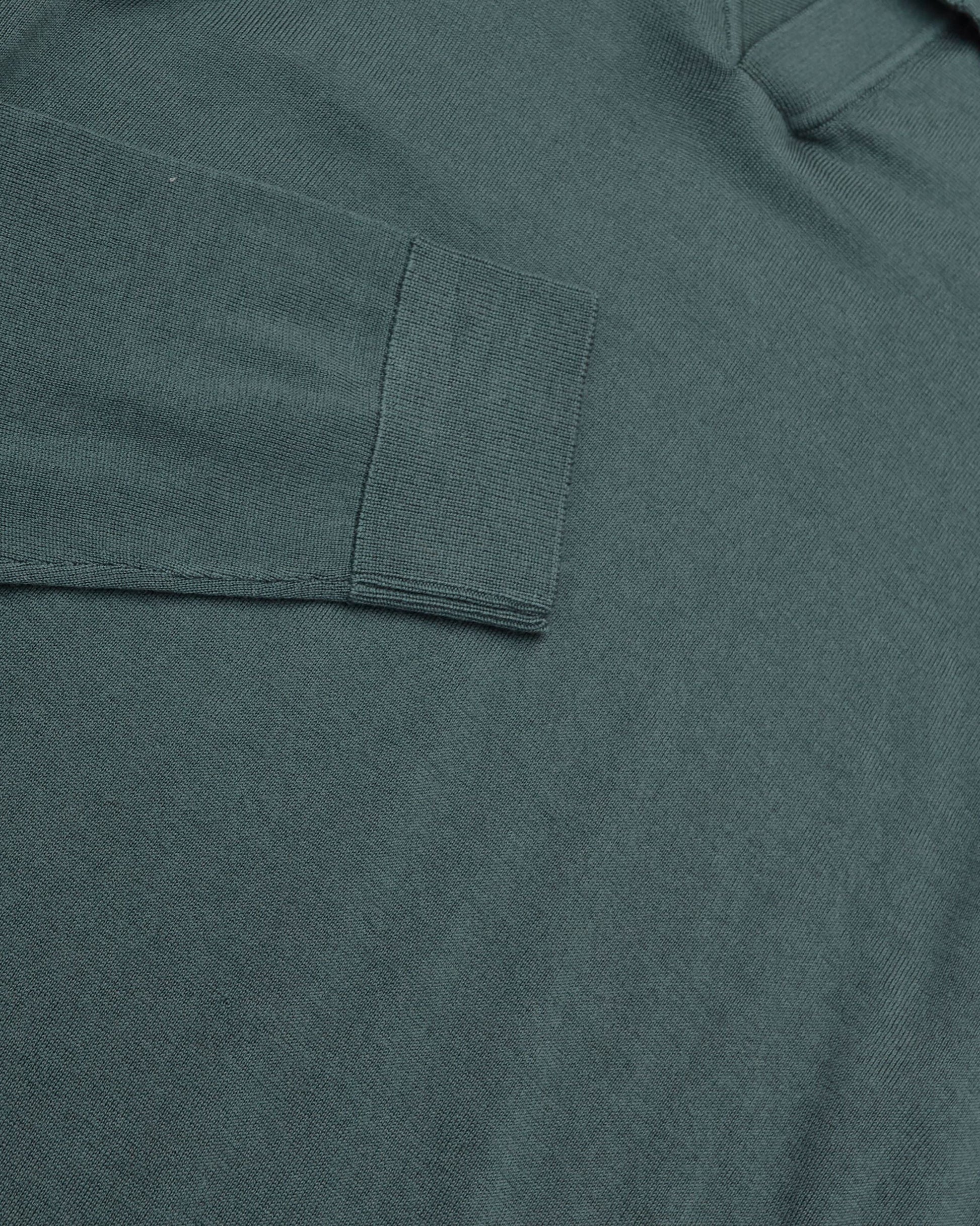 Colore verde scuro, in maglia di lana Merino. Design semplice con colletto a polo, privo di loghi o ricami visibili.