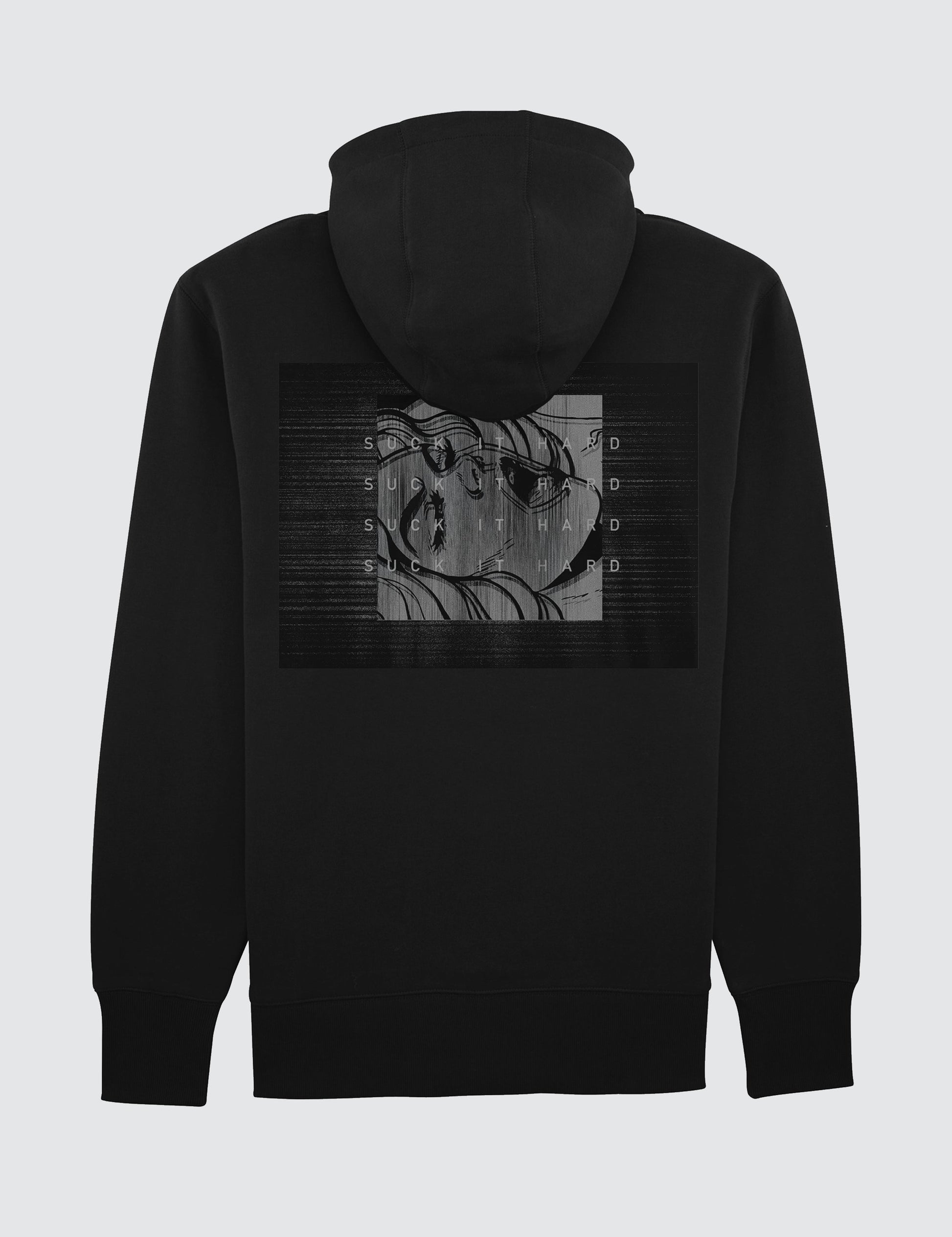 Suck It Hard Hoody features embroidery minimal logo on front and graphic print on back.