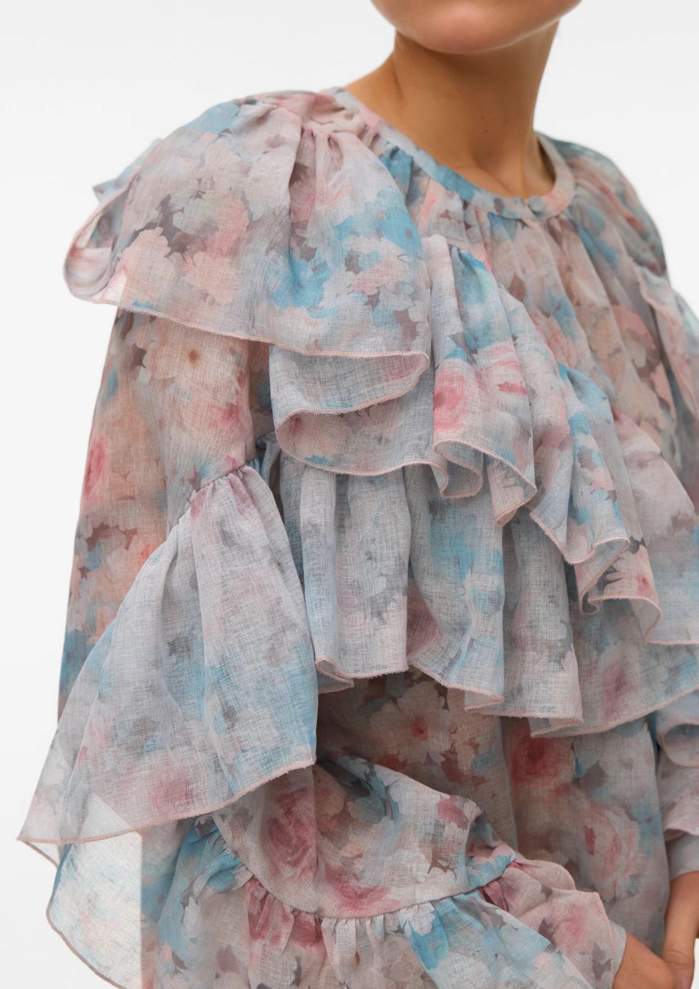 Blusa elegante dal design femminile e raffinato, perfetta per passare da un look casual a uno da festa con semplicità. Realizzata in 100% poliestere riciclato, offre leggerezza, comfort e un tocco sostenibile. Presenta scollo paricollo, maniche lunghe e voluminose con dettagli a volant che aggiungono movimento e romanticismo. La vestibilità regular fit la rende ideale da abbinare a pantaloni eleganti o gonne per un outfit chic e versatile. Composizione 100% poliestere riciclato.