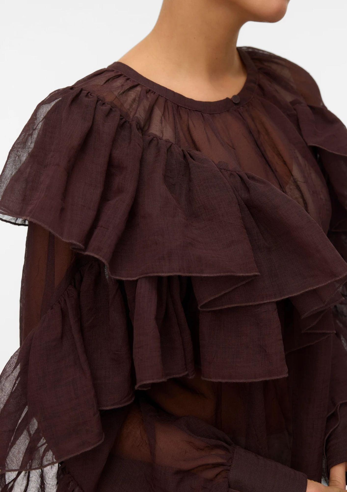 Blusa elegante dal design femminile e raffinato, perfetta per passare da un look casual a uno da festa con semplicità. Realizzata in 100% poliestere riciclato, offre leggerezza, comfort e un tocco sostenibile. Presenta scollo paricollo, maniche lunghe e voluminose con dettagli a volant che aggiungono movimento e romanticismo. La vestibilità regular fit la rende ideale da abbinare a pantaloni eleganti o gonne per un outfit chic e versatile. Composizione 100% poliestere riciclato.